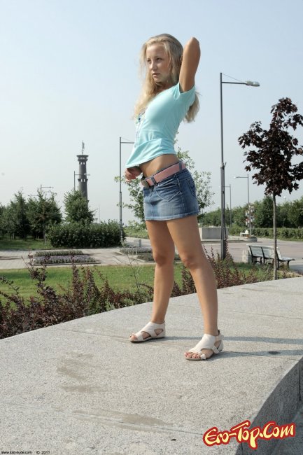 Была хорошая солнечная погода и красивая русская разделась на улице и даже не засмущалась того, что ее прелести может увидеть какой-нибудь случайный прохожий. Сексапильная белокурая худышка с красивой небольшой грудью и пирсингом в пупочке сначала показывала черные трусики под юбкой, после чего сняла их, и светила бритой киской как полагается.