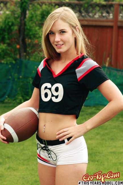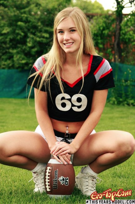 Голенькая американская футболистка вышла во двор в спортивной форме, захватив с собой мяч, и принялась мило красоваться и стрелять глазками. Затем милашка с шикарной улыбкой начала сбрасывать с себя одежду, под которой была маленькая грудь и киска с интимной стрижкой. Так же следует отметить, что у смазливой блондиночки был пирсинг в пупочке.