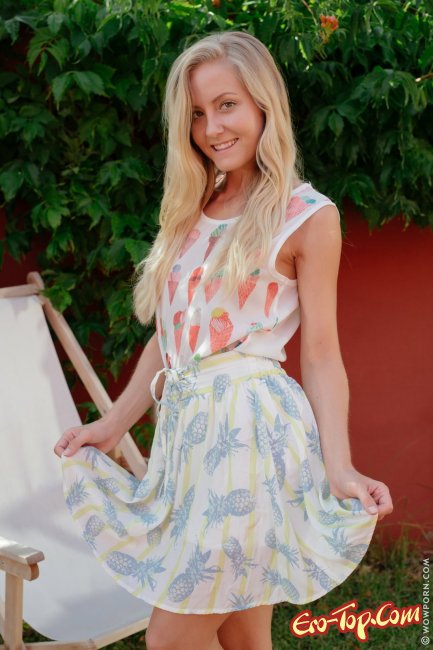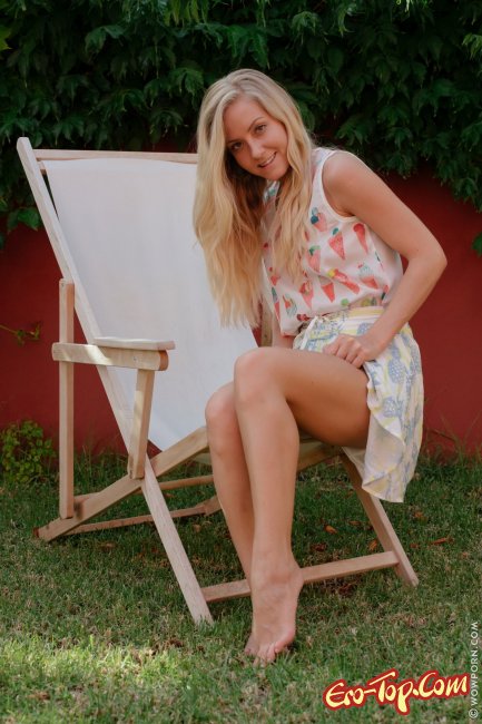 Выйдя на задний дворик своего дома, привлекательная светловолосая девушка решила показать свою киску и снять платье. Устроившись возле стула и оголившись, блондинка начала позировать, даже вставать раком на траву, показывая себя с более сексуальной стороны в любимой многими позе.