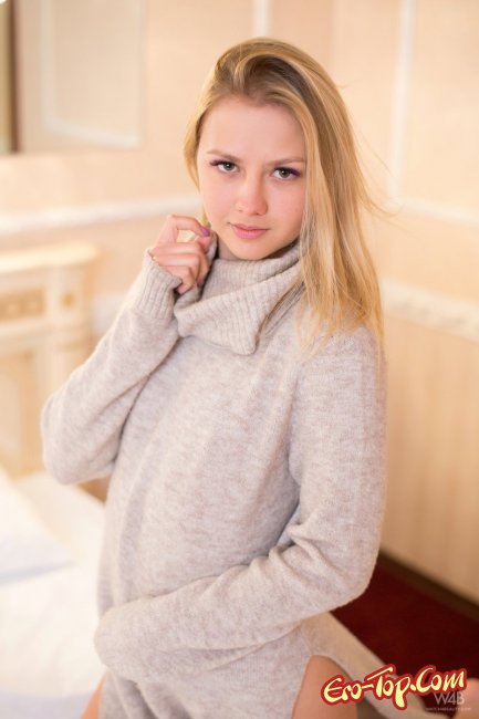 Привлекательная милашка с крошечной грудью запрыгнула на кровать и принялась сексуально выставлять интимные места на показ. Обнажившись, деваха принялась хвастать гладкой киской, которую она даже немного приоткрыла пальчиками. Белокурая озорница имела приятное лицо и красивые глаза, которыми она ловко стреляла.