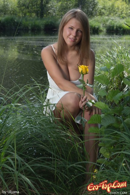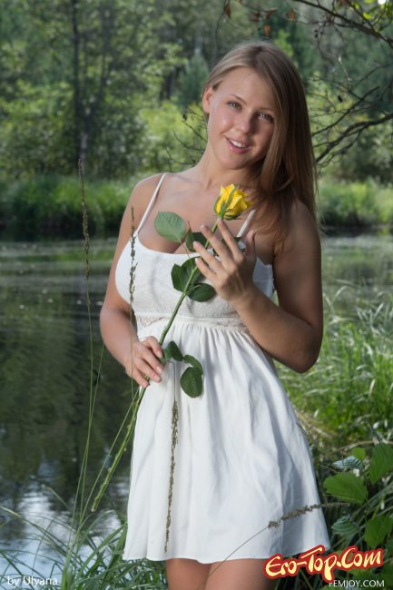 Красивая блондинка выйдя к озеру решила продемонстрировать свою крупную натуральную грудь, скрывающуюся под белым платьем. Раздевшись девушка устроилась раком на бревне и начала светить невероятно сексуальной и гладенькой киской, при этом не забывая про пышные сиськи.
