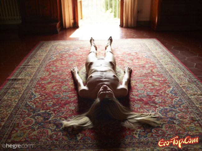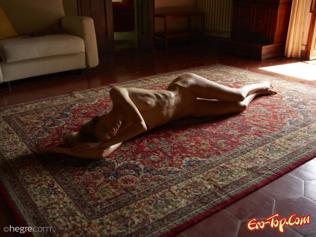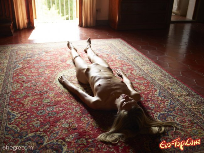 Красивая блондинка решилась полностью раздеться и продемонстрировать свое невероятно худенькое тело на фоне старого ковра из советской эпохи. В обнаженном виде она позировала возле балкончика, а после, улеглась на пол и поворачиваясь разными частями тела к камере, показала маленькую грудь с бритой киской.