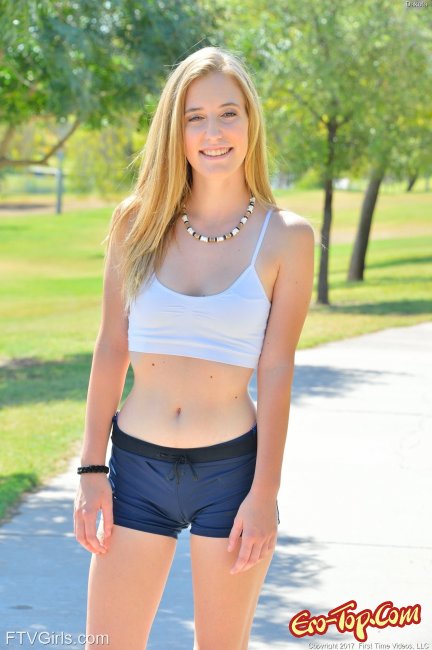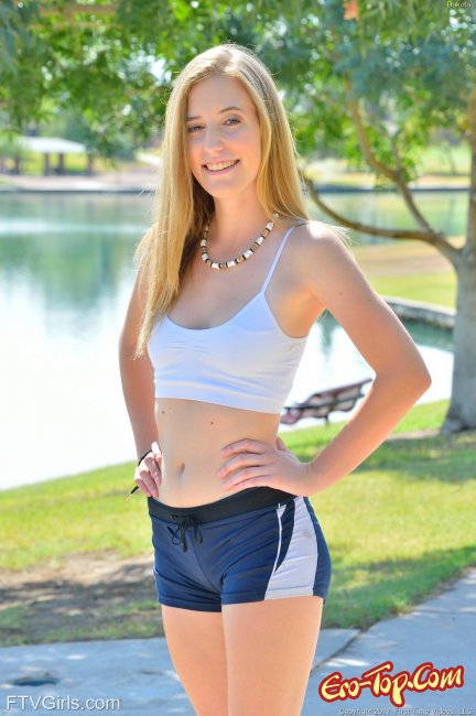 Привлекательная спортивная блондинка выйдя на пробежку, в какой-то момент захотела стянуть с себя коротенькие шортики с майкой и продемонстрировать сексуальное тело перед фотокамерой. Сделав это, девушке удалось засветить маленькую грудь и невероятно возбуждающую попку с упругими ягодицами, а так же бритую киску.