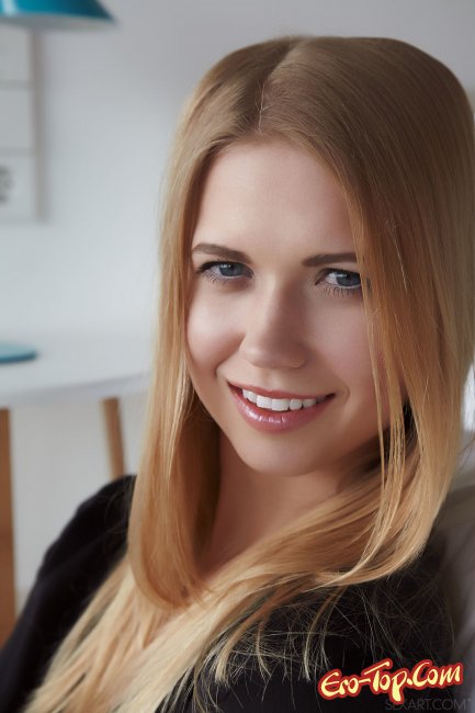 Девушка показывает гладенькую киску в спальне на полу