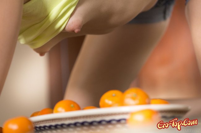 Сексуальная блондинка с вьющимися волосами, расположилась на кухне и начинает медленно раздеваться, приподымая майку и стягивая коротенькие джинсовые шортики. Оголившись полностью, соблазнительная девушка взбирается на стол и показывает нам маленькие сиськи, а затем, поворачивается к камере круглой попкой и открывает прелестный вид на свои упругие ягодицы.