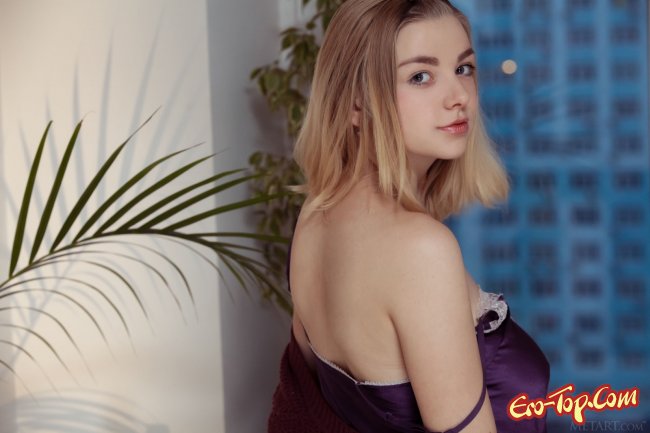 Молоденькая обворожительная блондиночка в привлекательном пеньюаре, начав медленно оголятся, демонстрировала натуральные висячие сиськи, в процессе присаживаясь на лавочку с мягкими подушками. Сидя на упругой попочке, красавица раздвигала промежность, позволяя нам рассмотреть гладко выбритую письку. В будущем подруга так же прогибалась раком, еще более подробно показывая возбуждающую щелку.