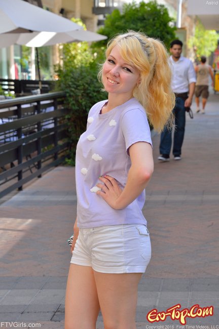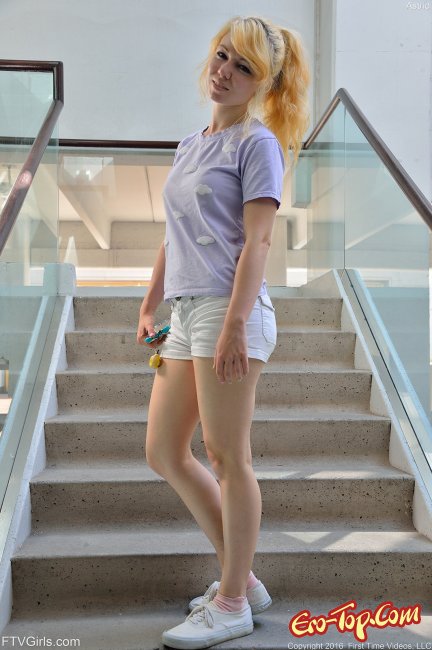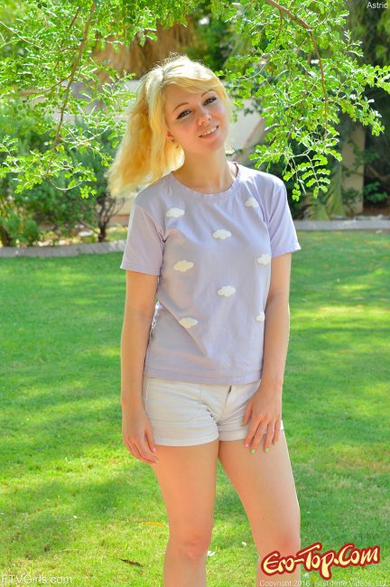 Нарядившись для прогулки, крашенная блондинка в коротеньких шортиках, футболке и кедах, параллельно начинает медленно раздеваться, для этого специально остановившись в парке. Располагаясь на коротко подстриженном газоне, молоденькая девушка засвечивает натуральные сиськи, а выгнувшись на мостике, демонстрирует бритую письку.