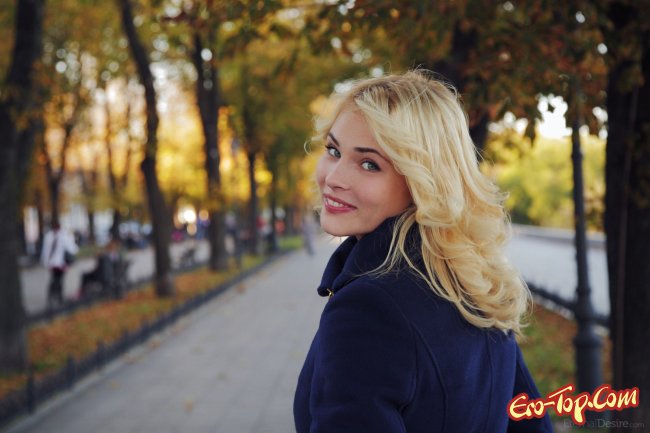 Привлекательная блондинка с пронзительным взглядом и вьющимися локонами, подышав свежим воздухом и вернувшись домой с улицы, устраивается в постели и медленно раздевается перед камерой. Мило улыбаясь красавица с маленькими сиськами ложится на спину и раздвигает длинные ноги, выставляя на показ бритую письку.