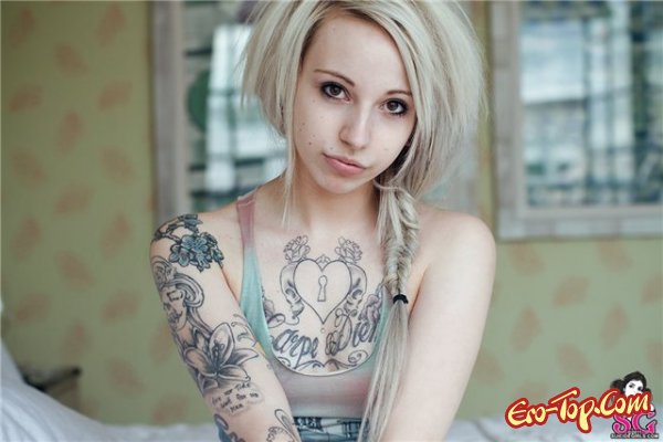 Молодая, голая девушка с множеством татуировок на юном теле. Бунтарка, сексуальная и непокорная девушка, и в это же время она настолько юна и мила, что невозможно устоять перед её обаянием. Девушка нежится в большой постели, и с каждой новой её позой нам открывается новая тату на её белой коже. Признаться честно, девка классная, мне такие нравятся, есть что-то в них... Что-то дикое и опасное, этакая плохая девочка, сама по себе, своевольная кошечка, которую не так просто завоевать и уж практически невозможно обуздать...