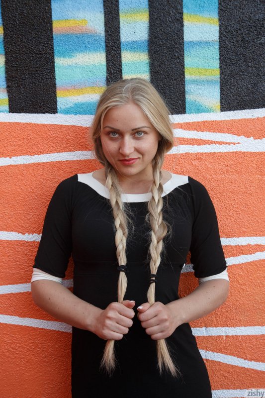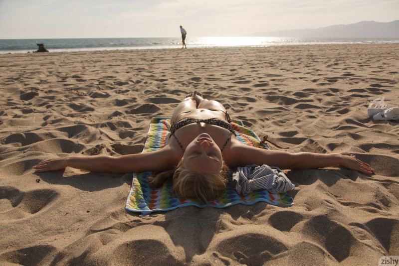 В момент прогулки обворожительная светловолосая девушка с косичками заглянула на пляж, где раздевшись до купальника принялась эротично позировать и показывать подкаченную попочку. В процессе молоденькая блондинка ложилась на подстилку и старалась чередовать разные позиции, грациозно прогибаться раком и максимально широко раздвигать ножки.