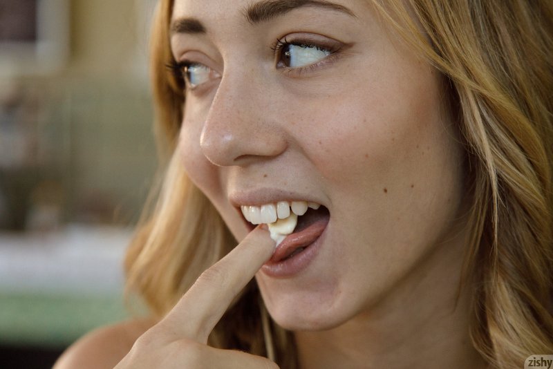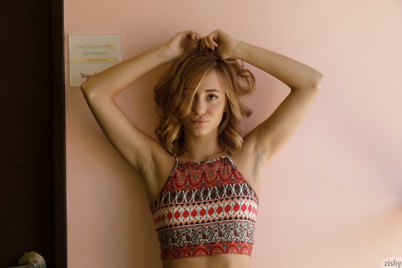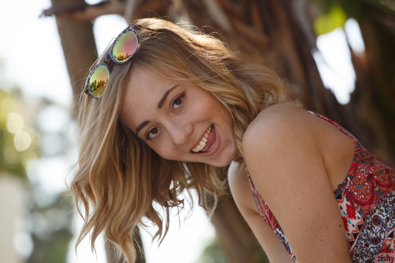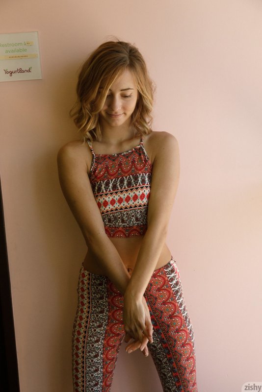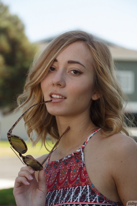 Привлекательная раскрепощенная девушка со стройной фигурой и светлыми локонами, нарядившись в красочный наряд, начала эротично позировать на улице и в кафе, в будущем немного оголяясь и подробно показывая упругие ягодицы. В процессе страстная крошка ощущала удовольствие и даже немного возбуждалась от происходящего.