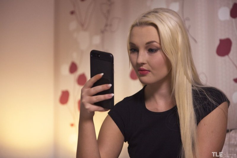 Сидя на кровати, очаровательная блондинка настолько возбудилась от прикосновений пальцами к промежности, что в будущем сняв колготки раздвинула ноги, продолжая удовлетворять бритую письку. Ощущая удовольствие, светловолосая девушка с маленькой грудью в дальнейшем вооружилась самотыком и проникла им во влагалище.