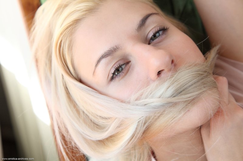Грациозно выгибая талию на кресле, красивая блондинка с пронзительным взглядом и плоскими сиськами, без трусиков в туфлях, максимально сексуально прогибается раком и оттопыривает голую подкаченную попу. В данной позиции стройняшка так же засвечивала бритую письку с пухлыми половыми губами.