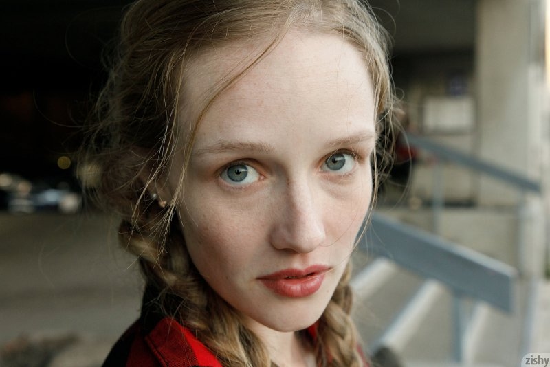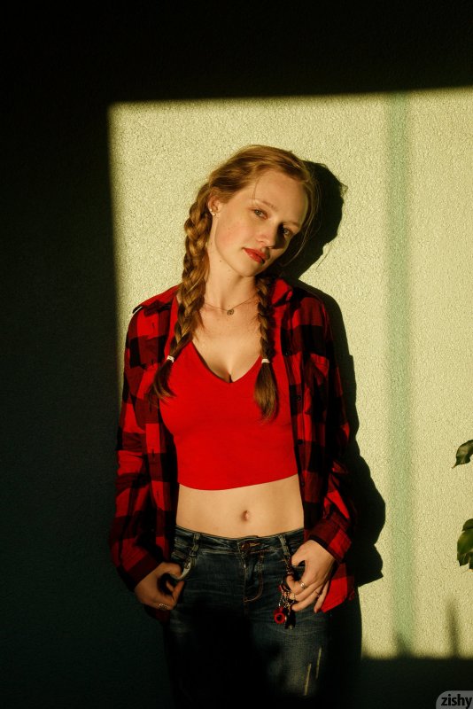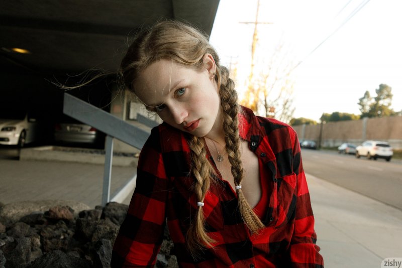 Перекусив в кафе и отправившись на прогулку, привлекательная девушка в клетчатой рубашке и с волосами завязанными в косички мило улыбается и ощущала желаемое удовольствие, в процессе стараясь засвечивать торчащий сосок на натуральной груди. Параллельно сексуальная милашка так же демонстрировала плоский животик.