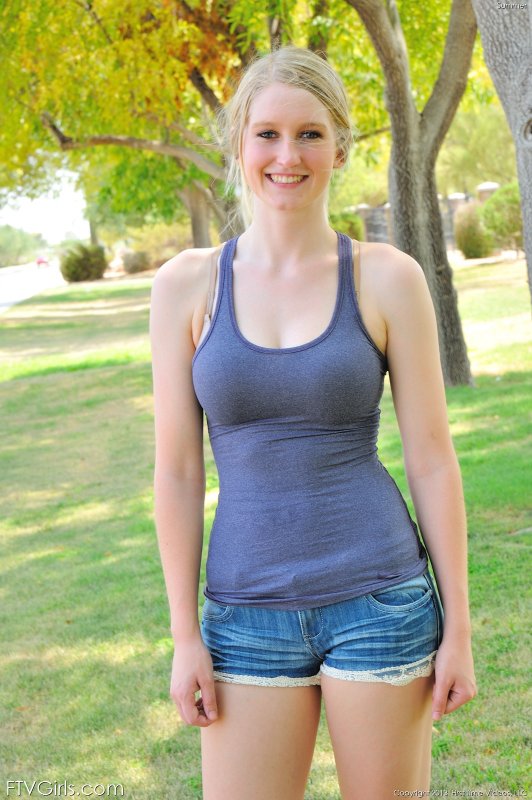 Симпатичная молодая блондинка, нарядившись в майку и короткие джинсовые шорты, прогулялась в парке, а вернувшись домой разделась на кровати и показала нам свои натуральные дойки. Возбудившись от позирования обнаженной, сексуальная девушка снова пошла на улицу и уже там продемонстрировала бритую письку.