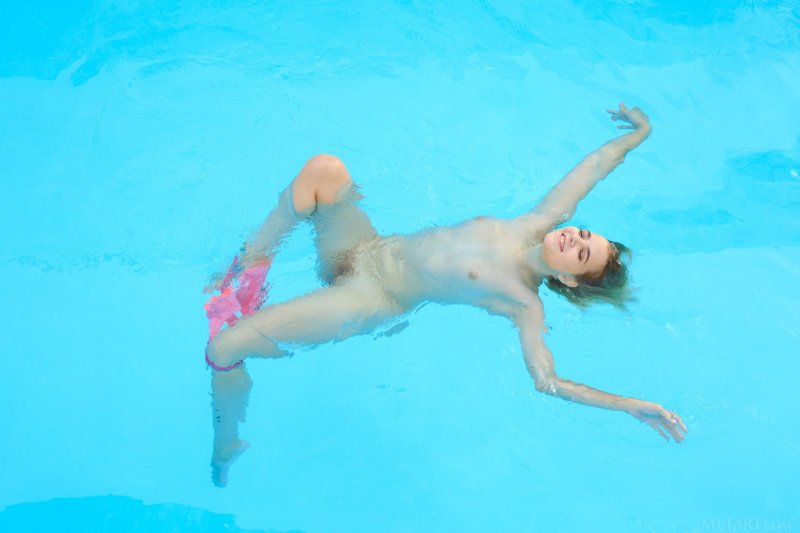 Заигрывая с фотографом, молодая блондинка скидывает с себя купальник и голая плавает в бассейне, ощущая на себе жаркие взгляды съёмочной группы. Выбравшись в дальнейшем из воды, сексуальная девушка с маленькой грудью продолжает позировать и получше демонстрирует свою сладкую попку с бритой киской.