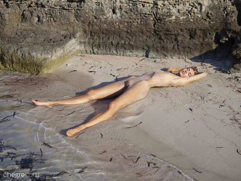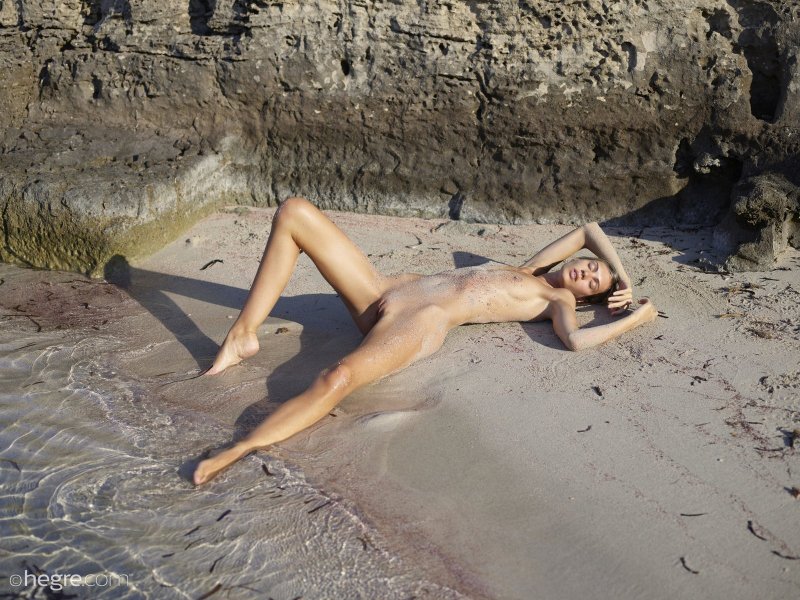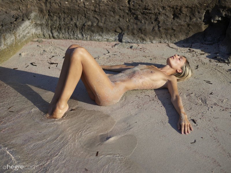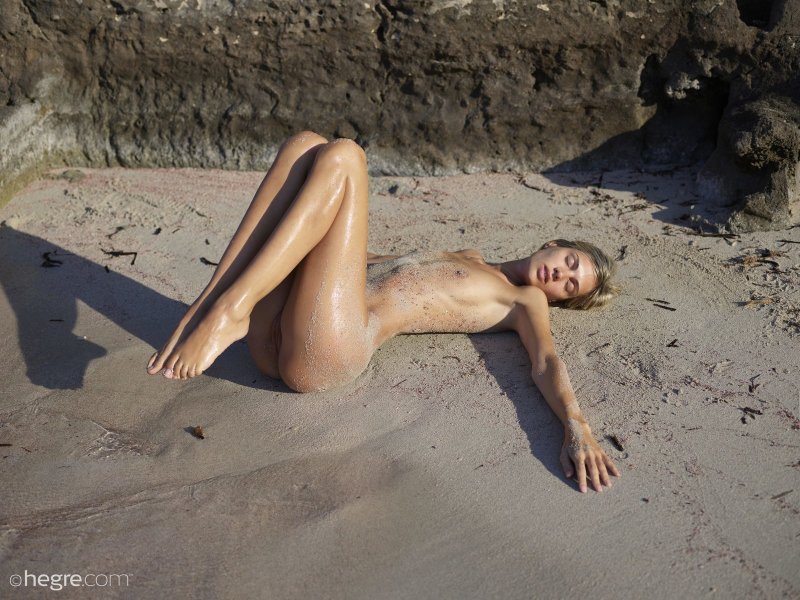Отыскав для фото съёмки уединенное местечко на пляже, привлекательная тощая блондинка голая лежит на песке и пробует самые разнообразные позы. Совершенно не скромничая и чувствуя себя уверенной, худощавая девушка с маленькой грудью вертит перед нами своей бритой киской и узкой попкой.