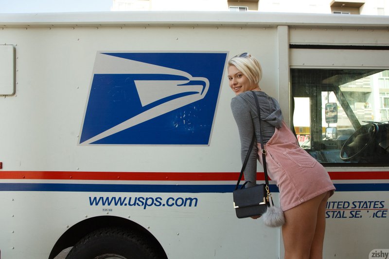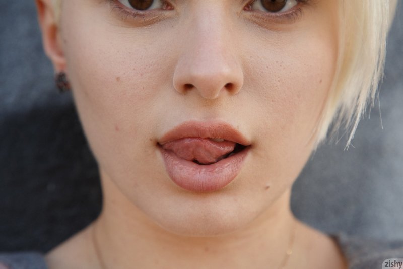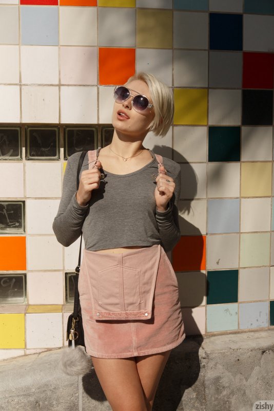 Молоденькая блондинка с короткой стрижкой прогуливается по городу и мило улыбаясь засвечивает маленькие торчащие сиськи с набрякшими сосочками. В процессе съёмки, стройная девушка пыталась казаться как можно более соблазнительной и порой задирала юбку, позволяя нам увидеть её трусики с упругими подтянутыми ляжками.