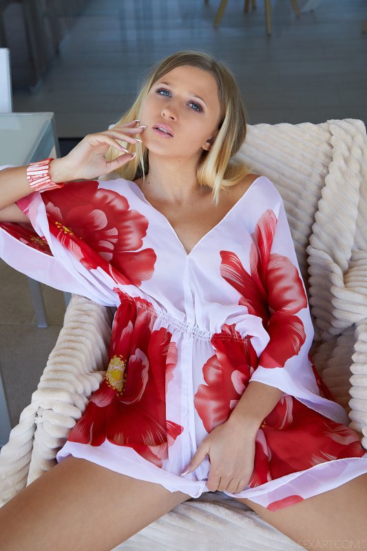 Очаровательная голубоглазая красотка, обнажённой устроившись на стуле, соблазнительно позирует для нас и скидывает с себя шёлковый халатик. Оставшись же совершенно голой сексуальная дамочка с аккуратными натуральными сиськами присаживается на корточки и широко раскрывает промежность нежно погладивая пальцами бритую письку.