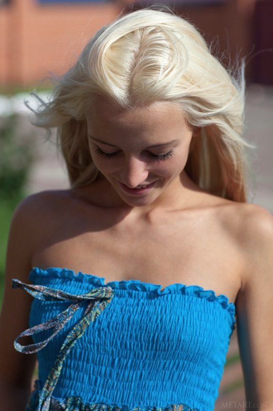 Симпатичная блондинка с худенькой талией, прогуливаясь на улице в платье без трусиков порой задирает его подол и показывает бритую сексуальную писю. Ощутив от демонстрации гениталий возбуждение, стройняшка в будущем расположилась на столе, стоящем в парке, и немного раздеваясь так же продемонстрировала маленькие сиськи.
