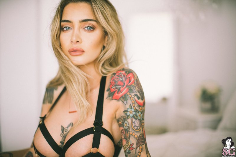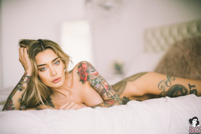 Лишённая комплексов, грудастая блондинка исколотая татухами по всему телу с наслаждением позирует на кровати, где снимая свой лифчик она обнажает перед нами большую натуральную грудь. Пытаясь казаться скромной, красотка с пухлыми губами, впрочем, не боится и скидывает трусики, при этом таки не показывая своего главного достоинства...