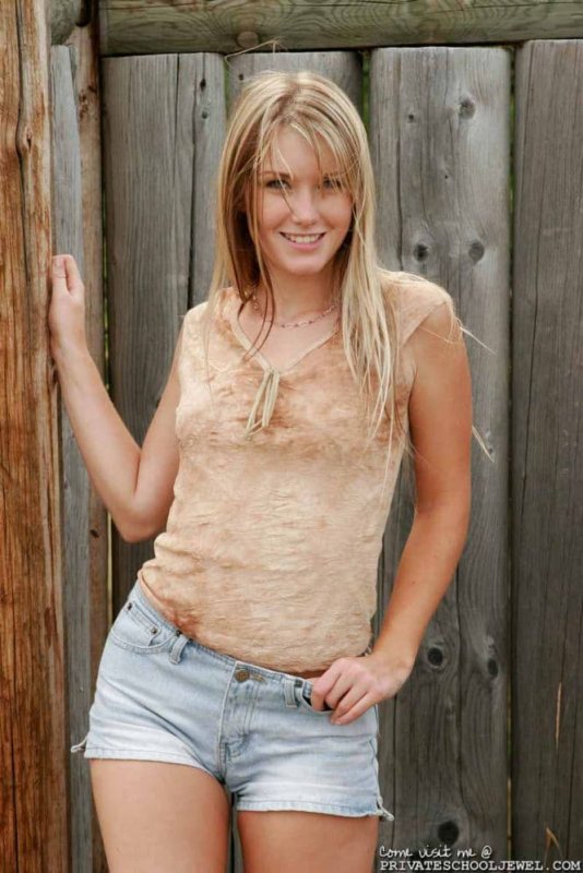 Отдыхающая летом в деревне очаровательная блондинка игриво на камеру стягивает свои короткие джинсовые шортики, чтобы показать сочную круглую попку. Красивая девушка со стройным нежным телом с маленькими упругими титечками, немного стесняясь, снимает с себя трусики и мельком засвечивают голую гладкую киску.