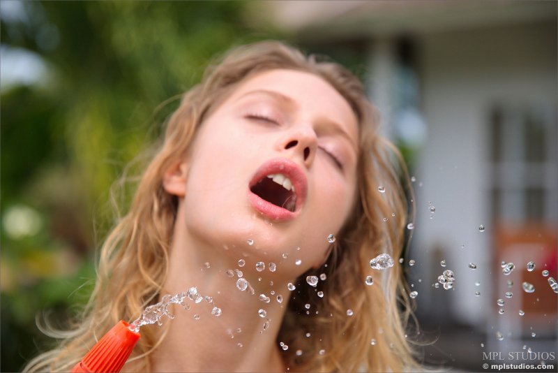 Очаровательная мокрая милашка игриво снимает с себя всю одежду и с удовольствием поливает себя прохладной водой из шланга, остужая свое горячее возбужденное тело. Голая блондинка с маленькими титьками страстно извивается всем телом перед камерой, чувственно показывая нам свою красивую упругую попку с сладкой киской.