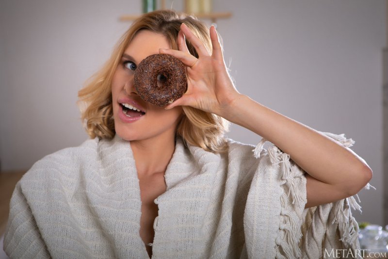 Недавно проснувшись и позавтракав, сонная сексуальная блондинка эротично скидывает с себя одеяло и соблазнительно позирует на большой кухне. Обнаженная красотка с маленькими сиськами бесстыже забирается на высокую столешницу и похотливо раздвигает ноги, крупным планом показывая нам свою бритую нежную киску с подстриженным волосатым лобком.