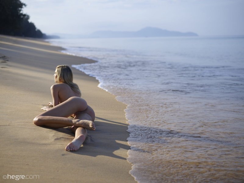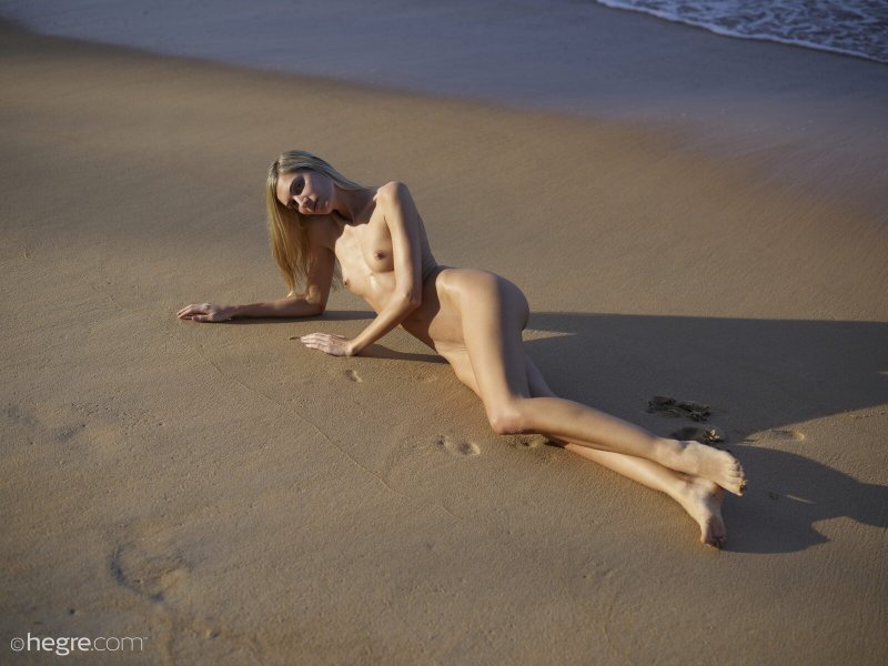 Изнывая от дикой жары, мокрая блондинка расслабленно лежит на горячем песке и бесстыже загорает голышом на берегу моря. Страстно извиваясь на пляже, обнаженная девица с маленькими титьками открыто демонстрирует свое худое тело перед камерой, развратно принимая разные соблазнительные позы с раскрытой бритой промежностью.