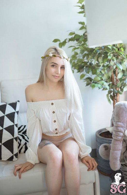 Скромная молодая нимфа в легкой белой одежде немного стеснительно сняла перед камерой свою кофточку с трусами и полностью оголила красивые упругие титечки. Удобно устроившись на диване, обнаженная милашка в позе раком игриво флиртует с фотографом, скрывая от него свою бритую писечку.