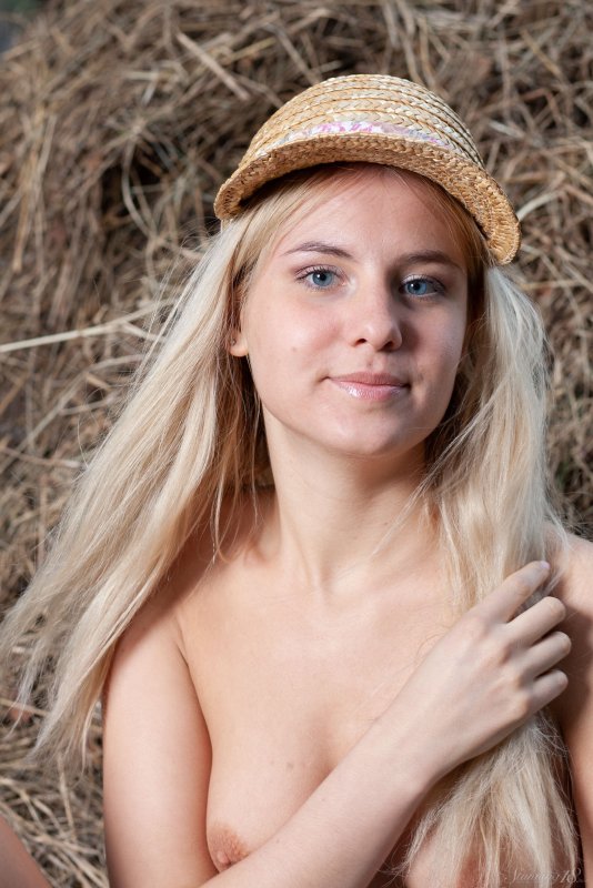 Энергично стянув с себя короткое летнее платье, простая деревенская девка открыто показывает нам свое стройное молодое тело и эротично позирует на сеновале. Голая блондиночка с аккуратными упругими титечками бесстыже высоко задирает перед камерой ноги, с разных ракурсов засвечивая свою бритую письку.