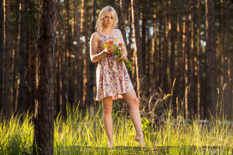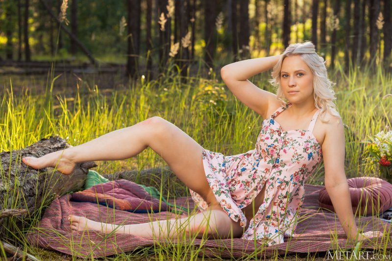 Быстро избавившись от всей одежды, обнаженная девушка расслабленно отдыхает на природе и наслаждается теплым ветром на своей нежной чувствительной коже. Соблазнительная блондиночка с маленькой грудью развратно позирует всем телом и, лежа на земле, с разных ракурсов бесстыже выпячивая на камеру свою голую бритую промежность с розовой сладкой киской.