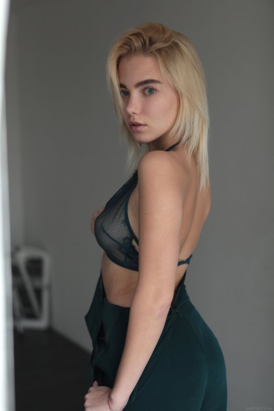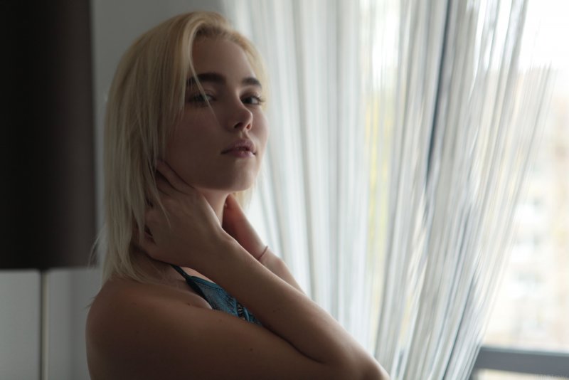 Эротично позируя перед камерой и постепенно снимая с себя одежду с кружевным нижним бельем, аппетитная похотливая детка с упругой грудью и попкой бесстыже демонстрирует свои прелести у большого окна. Затем обнаженная блондинка с сексуальным телом возбуждающе извивается в разных позах и в полумраке засвечивает свою голую бритую писечку.