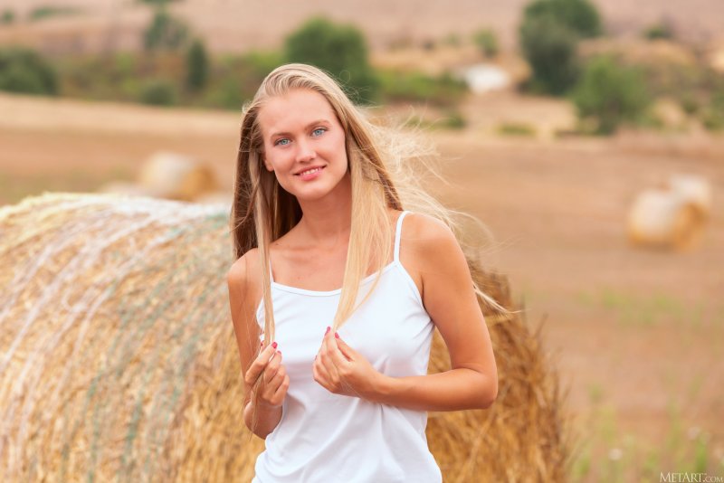 Спрятавшись за большим стогом сена, деревенская дылда в сайке и шортах бесстыже разделась до гола в поле и тут же принялась демонстрировать на камеру свои прелести. Белобрысая баба развратно выпячивает свои натуральные сиськи и плоскую задницу, но почему-то стесняется показать нам во всей красе свою голую бритую письку.