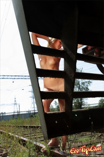 Стройная блондиночка голая на вокзале, а позади неё огромный локомотив, на плане которого хрупкая девушка кажется маленькой и ранимой. У красавицы прекрасная грудь небольшого размера, идеально сложённая, упругая и подтянутая, с красивыми, аккуратными сосками. Так же у девушки довольно привлекательная попа, глядя на которую, невольно просыпается желание поиграться с ней, утопив в своих ласках и не только... Если же говорить о фото в целом, то они получились яркими, пропитанными летним настроением, прохладным ветром и запахом цветов смешанным с железной дорогой. К тому же все фото высокого качества и большого размера, что позволяет насладиться ими в полной мере...