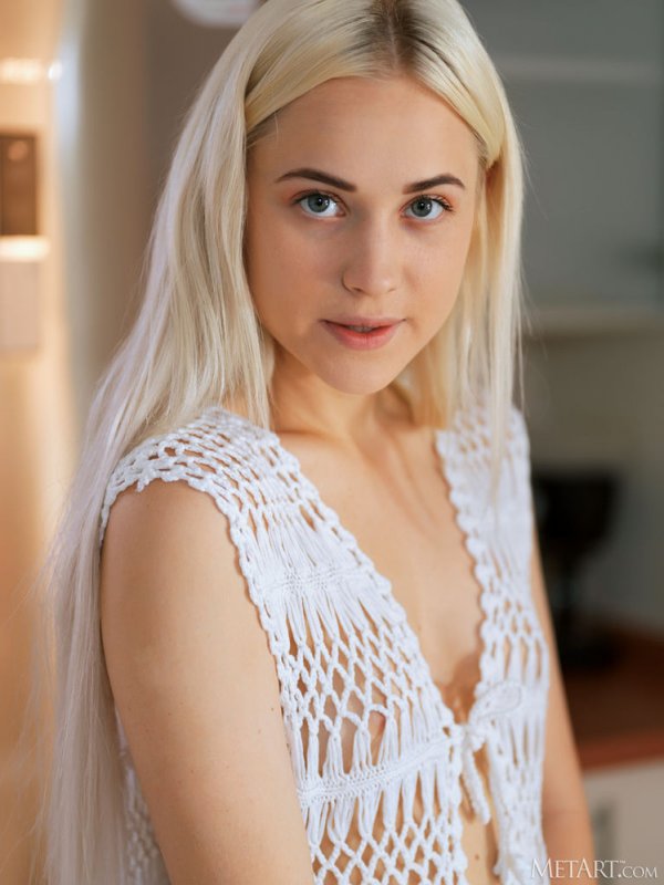 Приготовив на кухне вкусный ужин и решив немного пошалить, молодая жёнушка медленно снимает с себя просвечивающую кофточку и вовсю светит на камеру своими голыми прелестями. Расслабленно развалившись на диване, нежная блондинка с маленькими сисями высоко задирает свои стройные ножки и крупным планом тычется вперед раскрытой промежностью с красивой розовой писечкой.