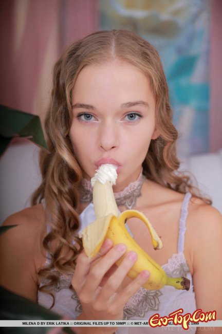 Чертовски привлекательная молоденькая фотомодель эротического жанра Milena D, расположившись на большом мягком диване и надев сексуальное нижнее белье, начала эротично кушать банан. После этого красотка оголила сексуальную небольшую грудь и розовую сладкую киску с небольшой растительностью. В обнаженном виде Milena демонстрировала все очарование своей роскошной юной и стройной фигурки.