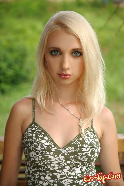 Сексуальная блондинка с большими зелеными глазками смотрит прямо в камеру и начинает медленно раздеваться. Телочка снимает короткие шортики, а потом и трусики. Слегка расставив ножки малышка похожая на куклу показывает голую киску с розовой щелкой. Потом она стягивает с себя маячку и ложится на скамейку, демонстрируя маленькие сиськи.