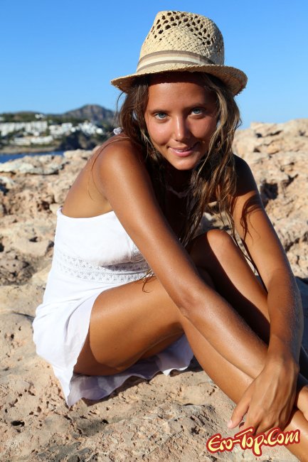 Симпатичная девушка эротично позирует на камнях в маленькой шляпе и белой кофточке. На ее теле даже нету трусиков, они ей просто не нужны в такую жаркую погоду. Малышка красуется возле побережья, показывая со всех ракурсов свое загорелое тело. Вскоре куколка полностью разделась догола и продемонстрировала сиськи вместе с красивой, голой задницей.