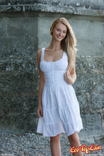 Красивая девушка позирует перед нами в сексуальном белом платье, стоя возле каменной стены. Великолепная телочка медленно снимает его и оголяет большие, упругие дойки с торчащими, твердыми сосками. И вот сучка полностью раздевается догола и нежно ручками мнет сиськи, а потом стоя в полный рост демонстрирует свою гладенькую писю и попку.