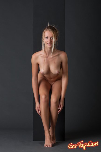 сексапильная блондинка с большими грудями позирует на темно-сером фоне в студии. Светловолосая телочка прижимается к квадратному столбу обнаженным телом, задирая руки вверх, а ножки расставляет в разные стороны стоя на носочках. Потом куколка мнёт свои мягкие груди, смотря в камеру большими глазками.