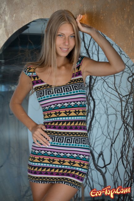 Клёвая светловолосая девушка с голубыми глазками, задирает обтягивающее коротенькое платье с рисунками, под которым розовые трусики. Блондинка полностью раздевается догола и демонстрирует грудь, а потом садится на маленькую попку, расставляет длинные ножки и начинает пальцами дрочить клитор на бритой киске.