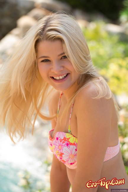 Блондинка с аппетитным телом снимает купальник и оказавшись совсем голой показывает нам свою бритую киску крупным планом, с различных ракурсов.