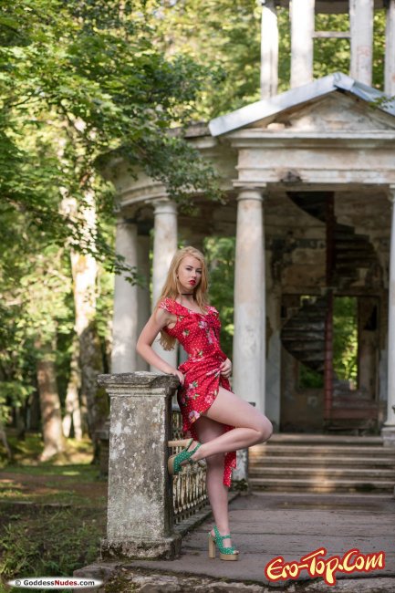 Шикарная грудастая девка с аппетитными формами, нарядившись в красочное платье и накрасив губки красной помадой, принялась позировать в парке, возле заброшенного здания, при этом медленно раздеваясь догола. В процессе съёмки, возбуждающей милашке удалось предельно откровенно засветить сиськи и письку с волосиками на лобке.