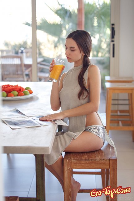 Красивая девушка завтракая на кухне, вдруг решила полностью раздеться и засветить свое сексуальное тело. Первым делом она сняла верх и продемонстрировала натуральную грудь с возбужденными сосками, далее стянула блестящие трусики и показала гладенькую писю.