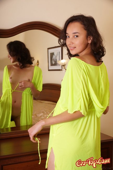 Привлекательная азиатская девушка в желтеньком халатике решила закрыться в спальне и полностью оголится, показав свое сексуальное тело. Начав раздеваться молодая красотка засветила маленькую грудь, с возбужденными сосочками, а так же весьма волосатую пилотку.