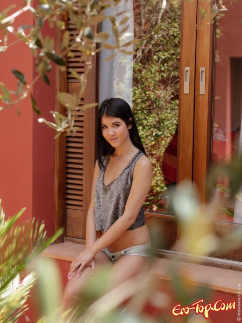 Симпатичная девушка в майке и коротеньких шортиках устроилась у окна и принялась эротично раздеваться, медленно снимая с себя шортики и другую одежду. Оголившись брюнетка засветила маленькие сиськи с торчащими сосочками и конечно же сексуальную гладенькую пилотку.