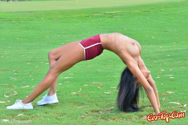Привлекательная спортивная темнокожая девушка решилась немного прогуляться. В какой-то момент ей захотелось оголится и показать сексуальное тело. Первым делом она засветила натуральные сиськи с возбужденными торчащими сосочками, а после приспустила шортики показывая бритую киску.