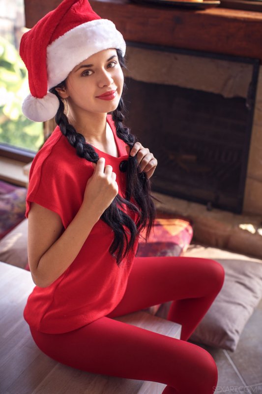 Молоденькая красивая брюнетка с косичками, устроившись рядом с камином на новый год, начинает эротично позировать и медленно раздеваться, стягивая красные колготки и футболку. Первым делом стройная крошка с длинными ножками выставляет на показ упругие натуральные дойки с торчащими сосочками, а после демонстрирует бритую письку крупным планом, параллельно лаская клитор пальчиками.