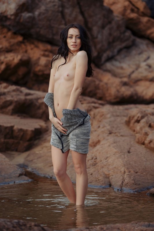 Оказавшись рядом со скалами и протекающим там ручьём, высокая брюнетка худощавого телосложения с маленькими сиськами и в кофточке принимается эротично позировать. В дальнейшем очаровательная худенькая брюнетка забирается в воду и ложась на спину демонстрирует нам свою маленькую грудь с торчащими сосочками и гладко выбритую письку, не забывая в будущем перевернутся на бок и выставить задницу.